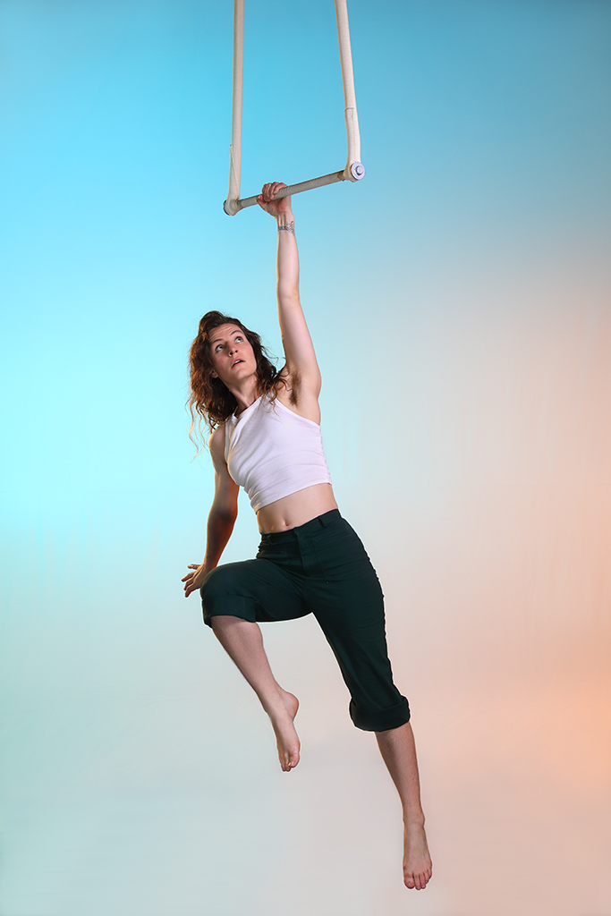 Michelle starting training in aerial circus in 2008 under the impression she was just picking up a hobby. Since then she has trained with Vulcana Women’s Circus, Trix Circus and Flipside Circus in a number of disciplines including Static Trapeze, Tissu, Lyra, Cloud, Acro-Balance, Hula-Hoop and Tightwire. She has performed with Vulcana Women’s Circus (FLUID, TIPPING POINT, THE MAGNIFICENT MONSTER CIRCUS, THE GRAVE EFFECTS OF NOTABLE WOMEN, STRING THEORY); Woodford Folk Festival (CABARET RED); Playon Productions (NAKED); and Violet & Veruca (HOLEPUNCH). She loves creating work with unlikely objects and devising with other mad individuals. Most recently she spent Summer of 2024 touring with ISLAND STORM for The Bureau of Silly Ideas, combining aerial net, hula hoop and Kung Fu to bring the story of a seaside arcade to life. Michelle regularly teaches sling and trapeze for Flying Fantastic in London, and pops up in other places every so often to teach workshops.She wears her awkwardness with an elegance which makes even the most ungainly among us feel like a prima ballerina.