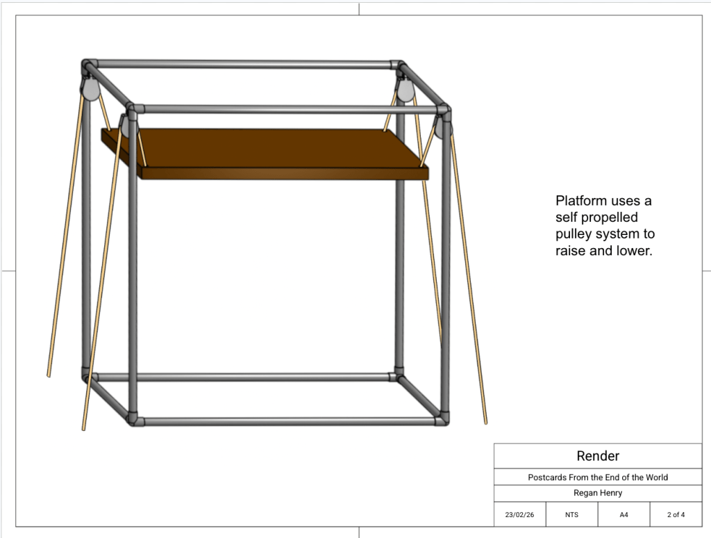 This project is in R&D at the moment, the story is still being written and the performance style is in development. Part of the planned process is to discover how audience members can be invited to move the platform, bringing the audience into the story.